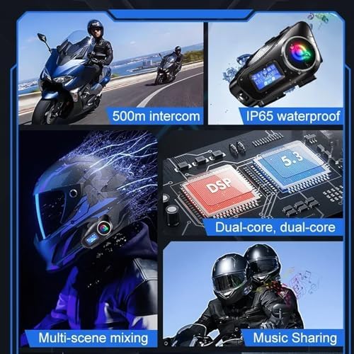Motorcycle Helmet Headset with Intercom Communication, Suitable for 2 People, Maximum Range 500m, 40mm Speaker, Supports Music Sharing, High-Definition CVC Noise Reduction Call Music Control This motorcycle helmet headset allows clear communication between two riders up to 300 meters away. TheQ58MAX intercom system easily fits into most helmets, and the motorcycle helmet intercom features noise-canceling technology for clear, static-free calls, even at high speeds. This motorcycle walkie-talkie headset is IP65 waterproof, making it resistant to rain and moisture, so you can focus on your ride. Bluetooth Motorcycle Headset Bluetooth connection enables wireless operation, allowing you to maintain freedom of movement on your motorcycle. Users can seamlessly listen to music, answer calls or use GPS navigation applications with integrated controls. helmet bluetooth headset with intercom Enjoy enhanced safety and entertainment while exploring the open road with this top-of-the-line motorcycle intercom system.