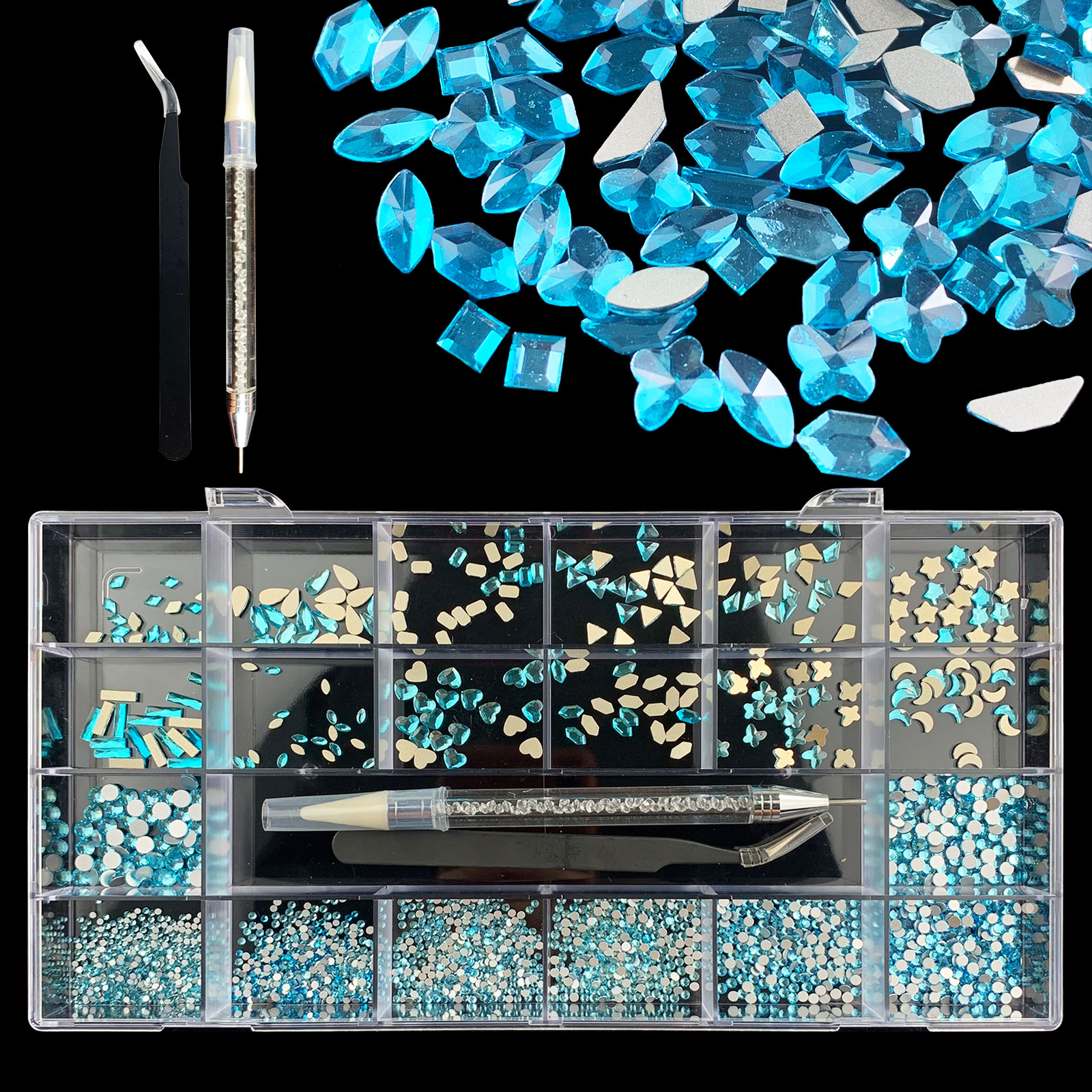1). 2500pcs Rhinestone set: 300pcs(25x12) k9 crystal glass rhinestones, 2200pcs mix sizes round rhinestones, 1pcs wax pen(Crystal or white), 1pcs tweezers for free