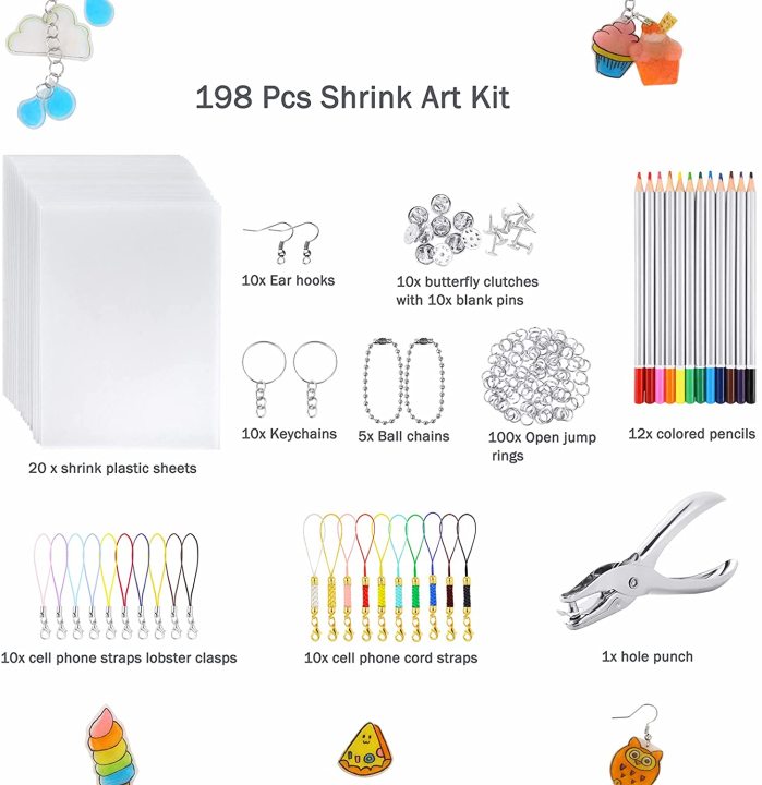 (3)198PCS/SET 20 x Blank Shrink Film Sheet, 12 x Color Pencils, 165 x Keychains Accessories, 1 x Hole Punch