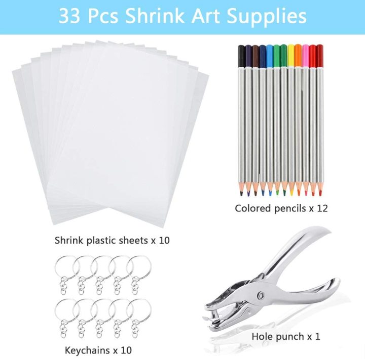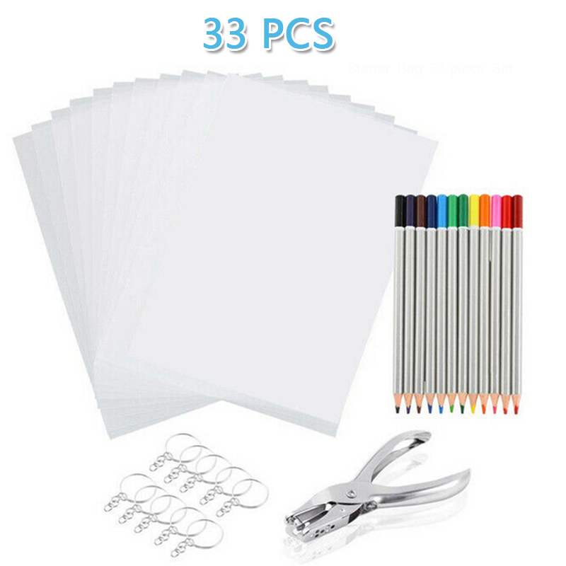 (1)33PCS/SET 10 x Blank Shrink Film Sheet, 12 x Color Pencils, 10 x Keychains, 1 x Hole Punch