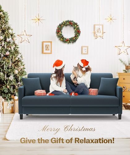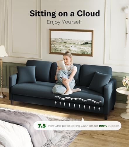 This is a nice looking sofa. The fabric is soft and it is relatively easy to assemble. The instructions recommend two people for assembly, but I was able to do it myself. There was some damage to the couch when I received it. I didn’t notice it until I had already put it together. I reached out to Amazon who put me in contact with Welzona, and they worked with me to rectify the situation. The pillows in the photo are not the pillows that came with the sofa. They were not good quality. The size of the sofa is great and it sets comfortably. Overall I am happy with this purchase.