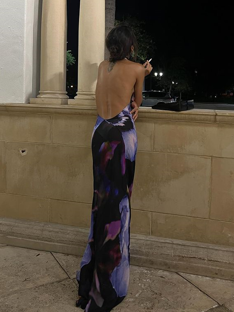 Backless Maxi Dress Women Sexy Purple Print Halter Bodycon Dress Summer Beach Outfits Elegant Sleeveless Club Party Dress