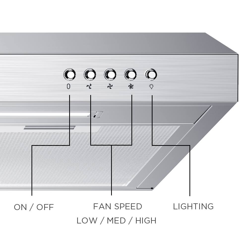 Low speed, used for general ventilation on the kitchen. Medium speed, ideally for ventilation in standard cooking operation. High speed for highest effective ventilation when high density of smoke produced.