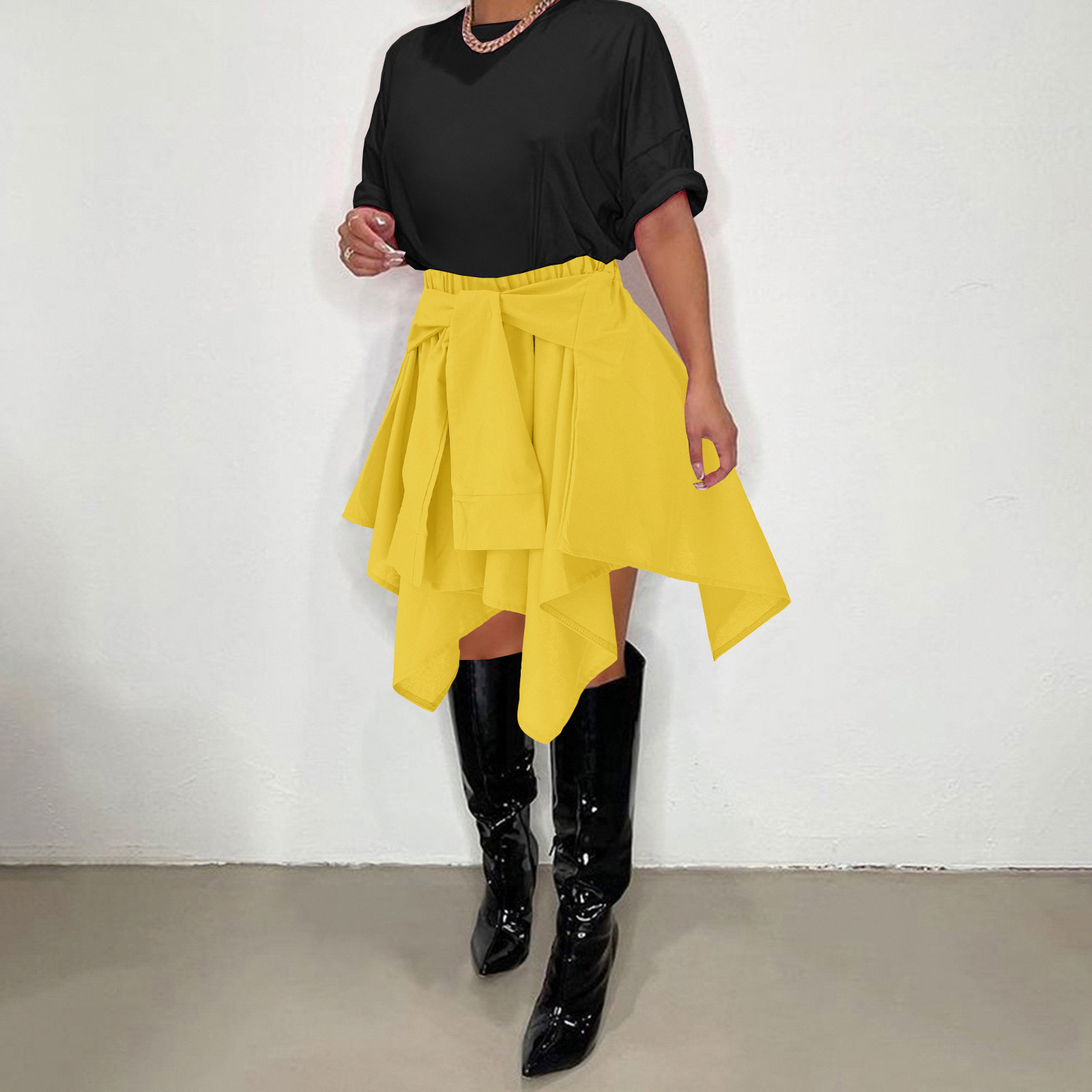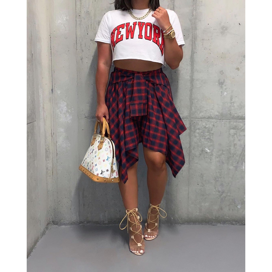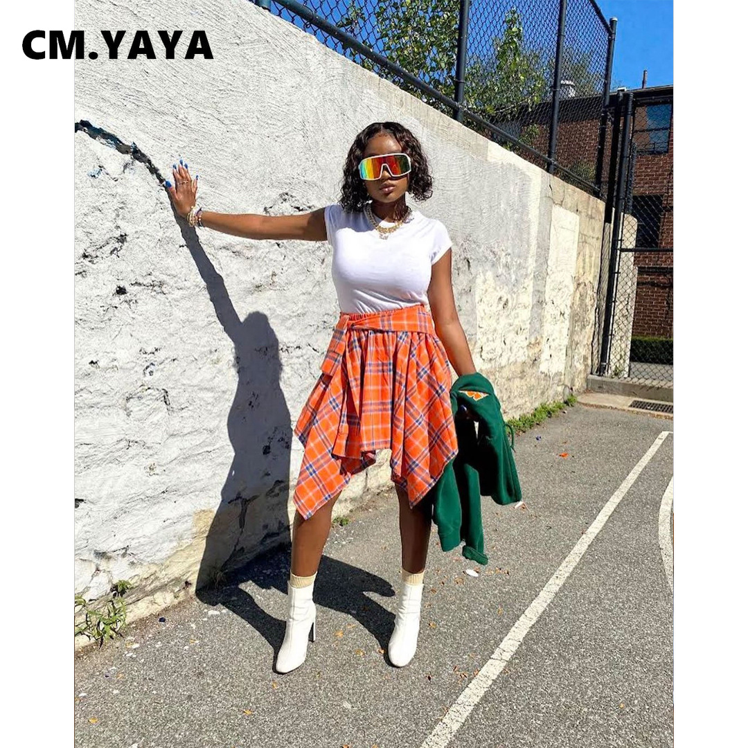 CM.YAYA Women Plaid Irregular High Waist Knee Length Skirts Summer Holiday Streetwear Sleeve Wrapped Lace Up Waist Skirt