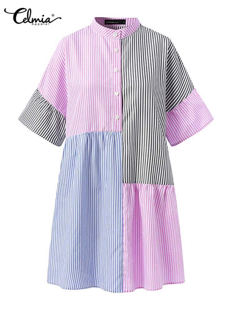 Celmia Stripe Patchwork Flare Half Sleeve Mini Dress Summer Elegant Casual Loose Buttons Short Sundress Women Shirt Dress