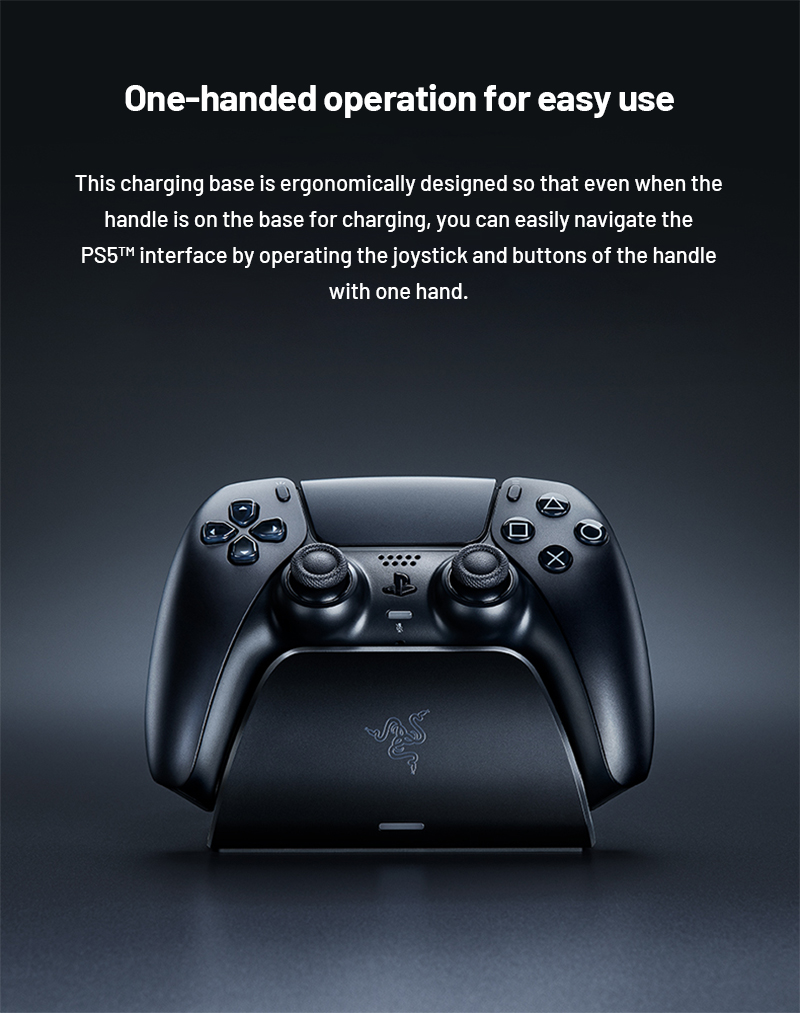This charging base is ergonomically designed, even when the controller is placed on the base for charging, you can easily operate the joystick and buttons of the controller with one hand to browse the PS5 system page.