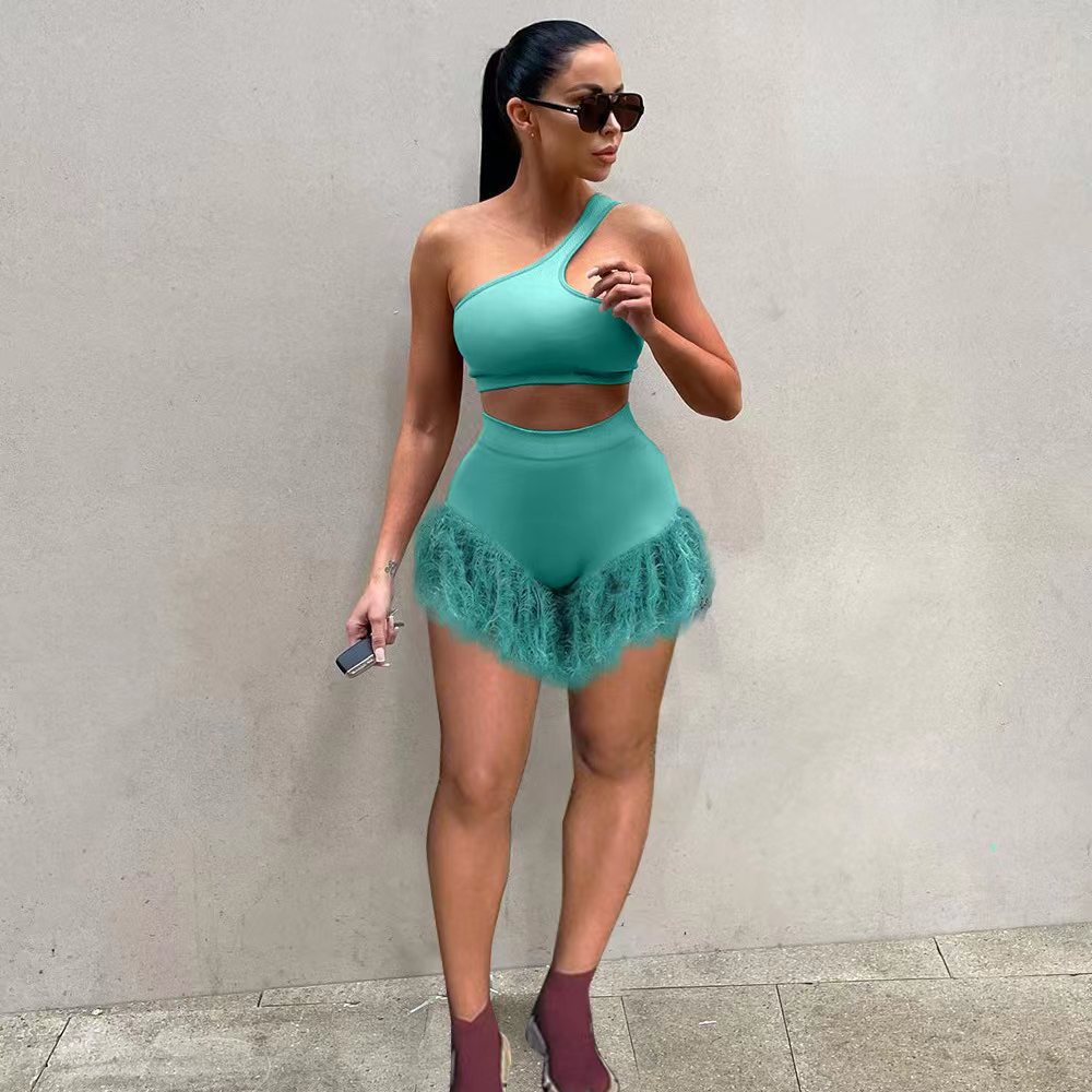 Echoine Solid Feather Fringe Shorts Crop Top Two Piece Set Summer Streetwear Women Sexy Bodycon Tracksuit Party Outfits