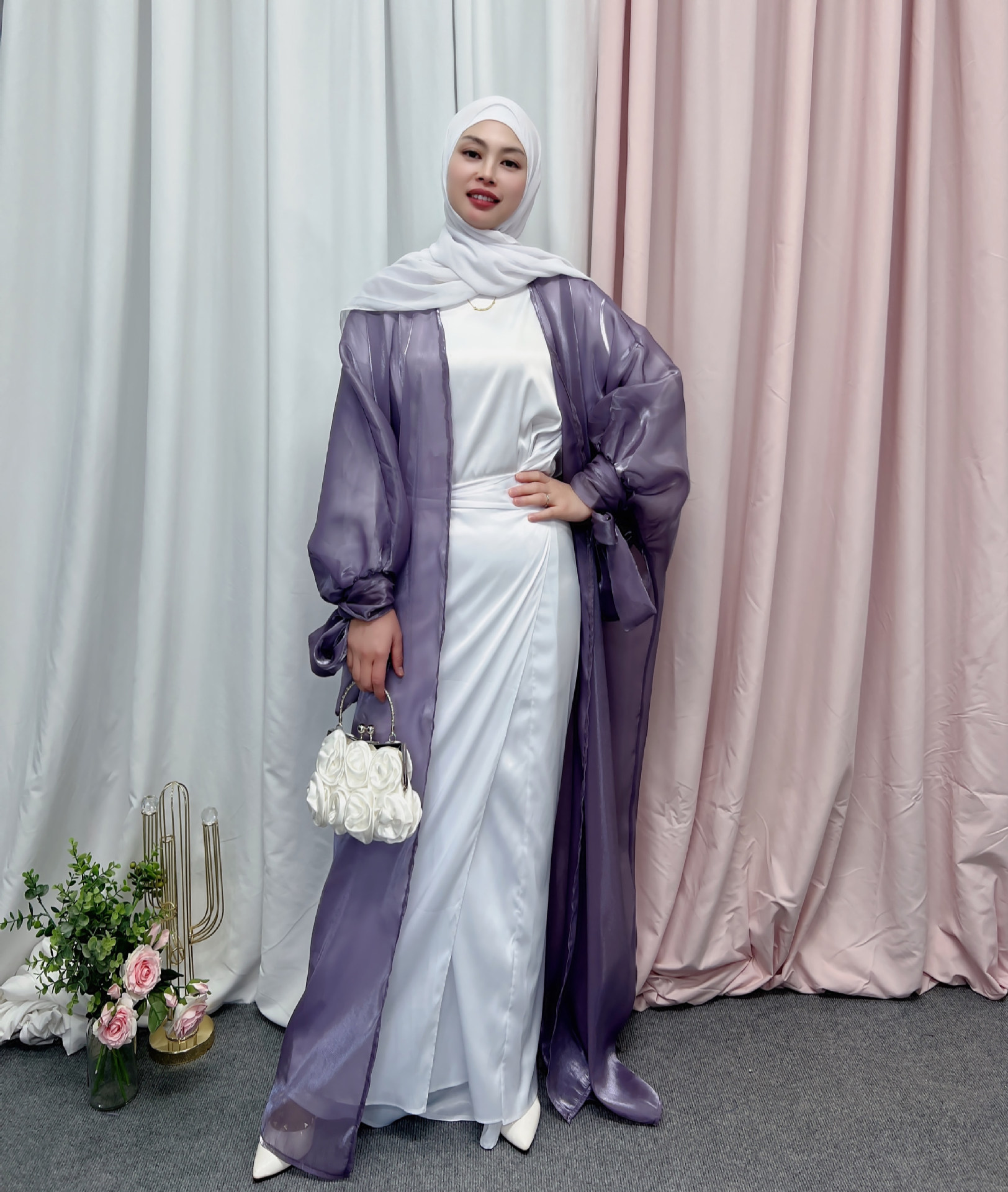 Eid Djellaba Women Abaya Dubai Soft Solid Puff Sleeves Muslim Dress Silky Kaftan Dubai Turkey Muslim Robe Islamic Abaya Cardigan