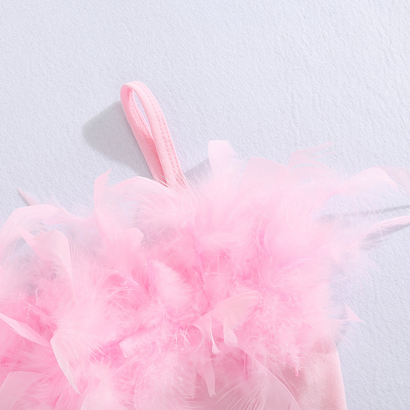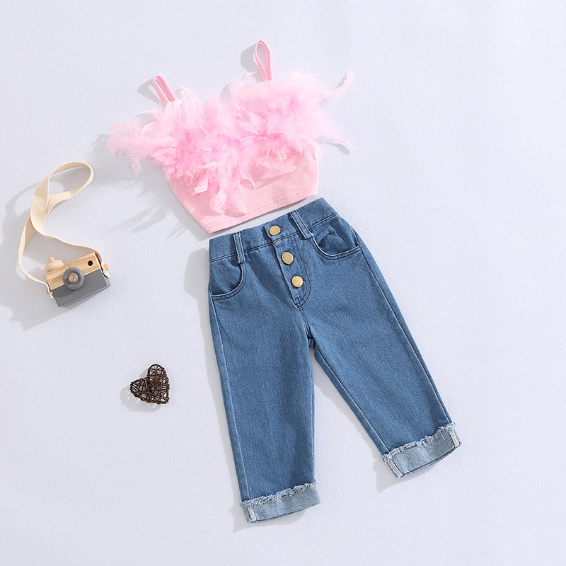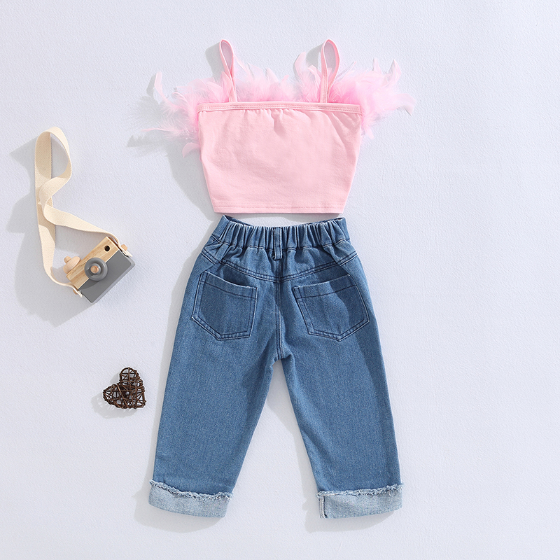 Toddler Girls Summer Outfit Sets Pink Sleeveless Feather Camisole + Denim Pants with Pockets