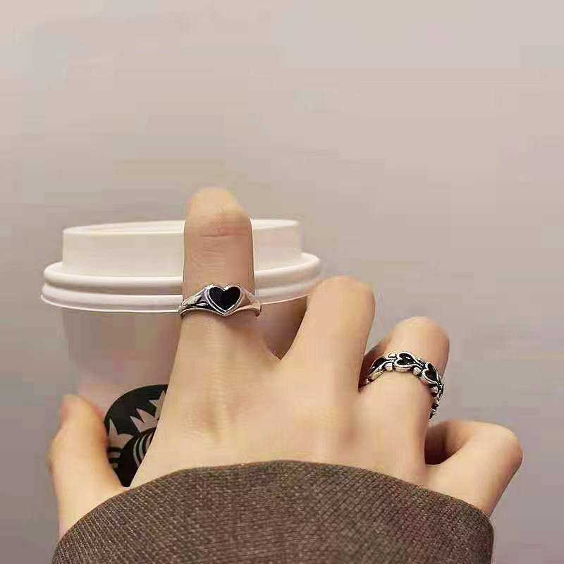 Goods : Korean ins trendy heart-shaped combination ring for men and women personality simple black love hollowed out adjustable