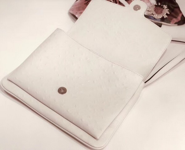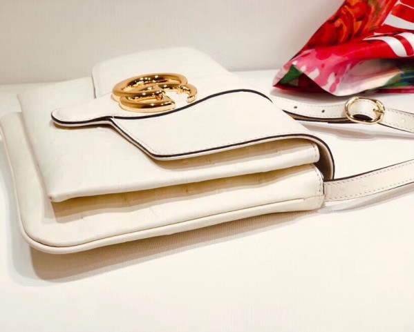 Brought back from the 1970s archives, the Double G hardware enhances the front of a medium shoulder bag in ivory ostrich, designed with double gussets and an exaggerated flap. The retro inspired silhouette was first presented in the Cruise 2019 fashion show, revealed in the evocative setting of the Roman necropolis of Promenade des Alyscamps, in the French town of Arles—which gives the name to the line.