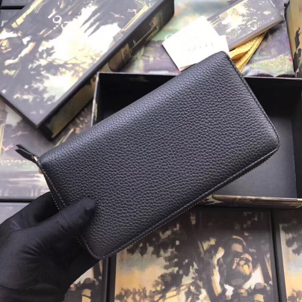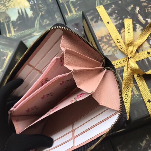 Metal studs in recognizable shapes, often inspired by the House’s romantic narrative, are displayed throughout ready-to-wear and accessories. Here, a delicate bow in antique gold-toned metal encrusted with sparkling crystals decorates the front of a zip around wallet, crafted in black leather. Light pink trims enhance the accessory’s refined charm.