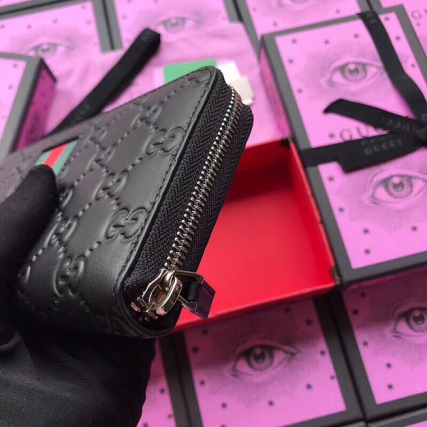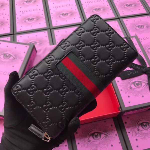 A combination of two of Gucci’s most recognizable codes: the GG motif and the Web. This zip around wallet is made in heat debossed Gucci Signature with Gucci Web stripe detail.