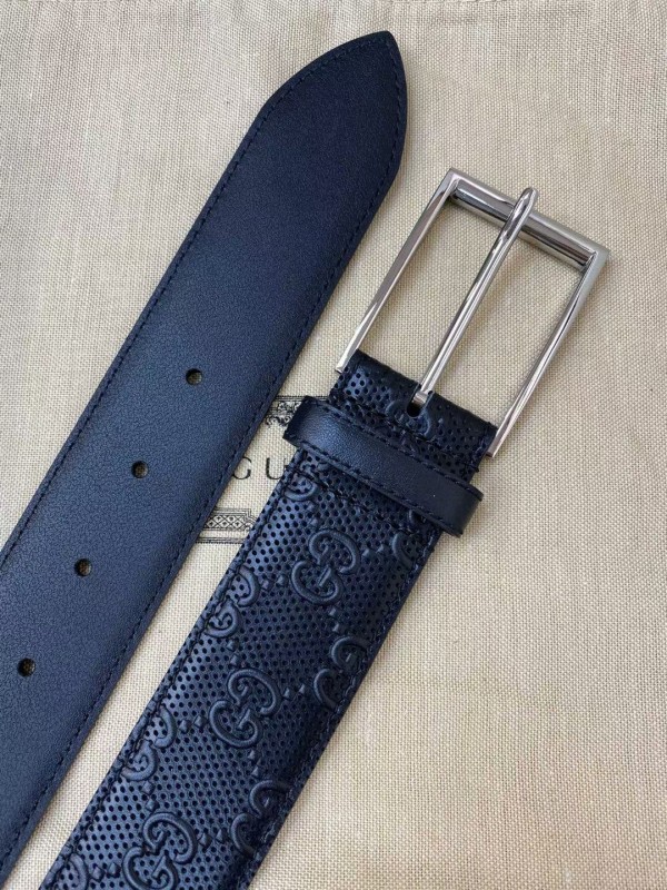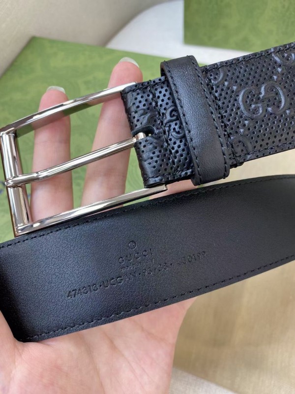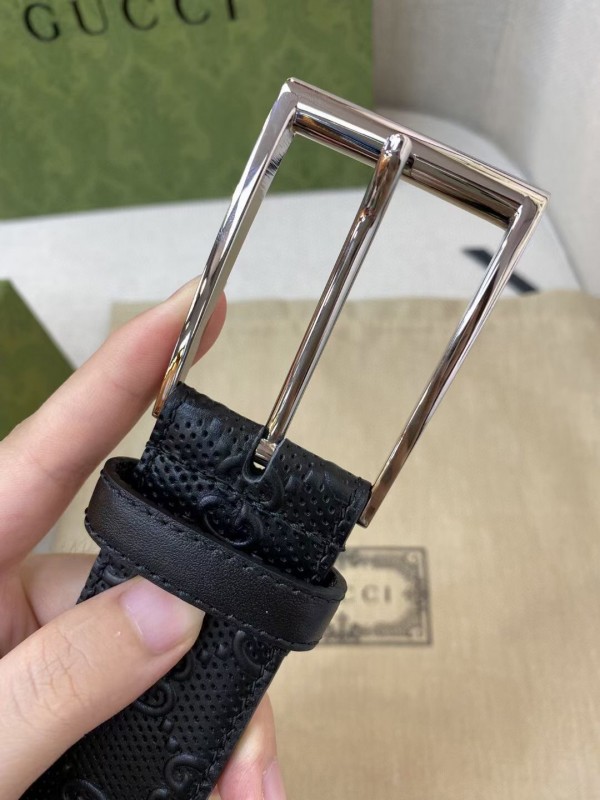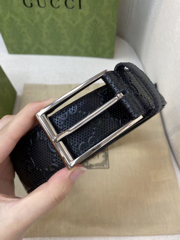 Understated, simple, sleek. With a tonal all-over GG logo, this GG embossed perforated leather buckle belt by Gucci does exactly what any good accessory should do – tie together your looks in an instant.