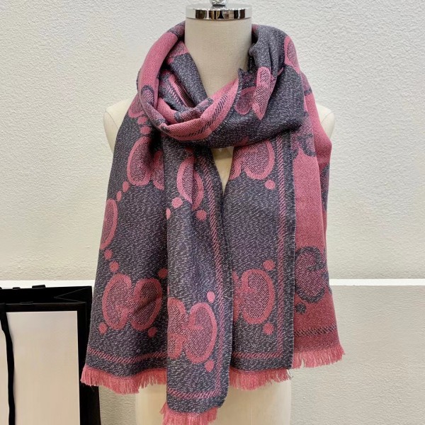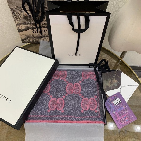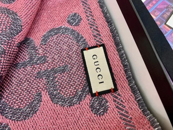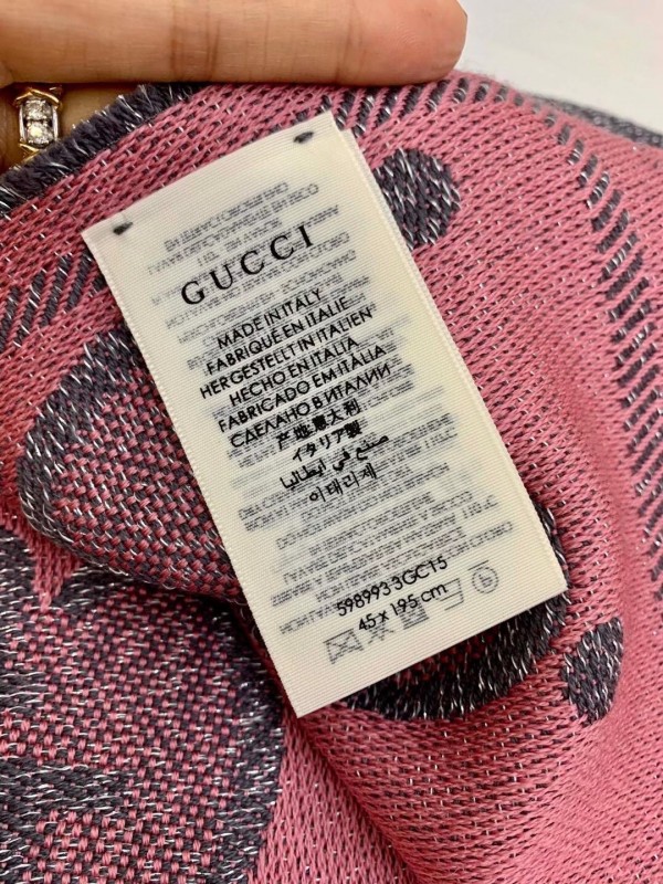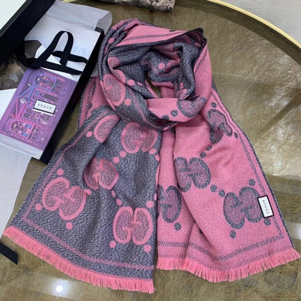 The initials of the founder of the House, Guccio Gucci, alternate across this jacquard scarf. Presented in a contrasting color combination that alternates on the front and the back, the accessory is further accentuated by sparkling lamé. Perfect for winter and mid-season weather. The fringed finish adds a final, luxurious touch.