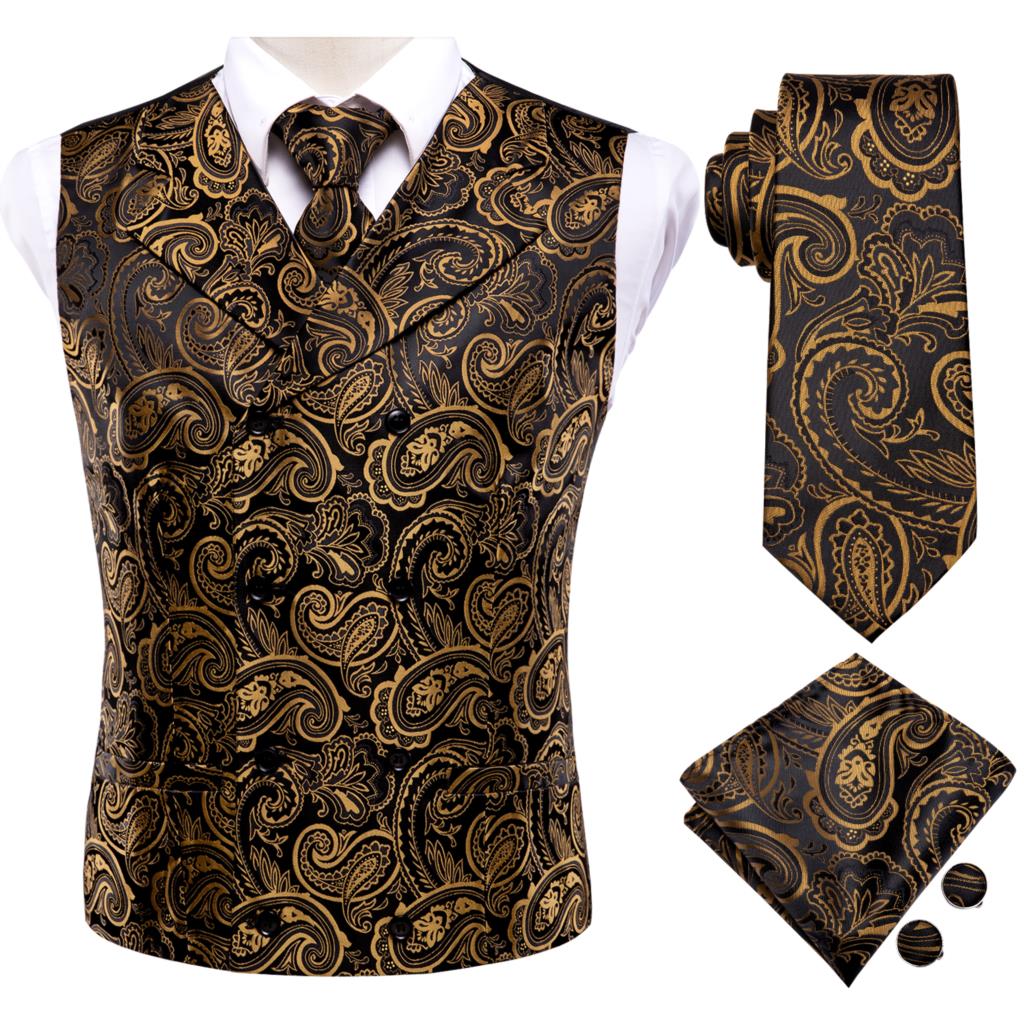 Hi-Tie Silk Ivory Beige Champagne Gold Mens Vests Tie Hankerchief Cufflinks Set Jacquard Vine Waistcoat for Men Suit Dress