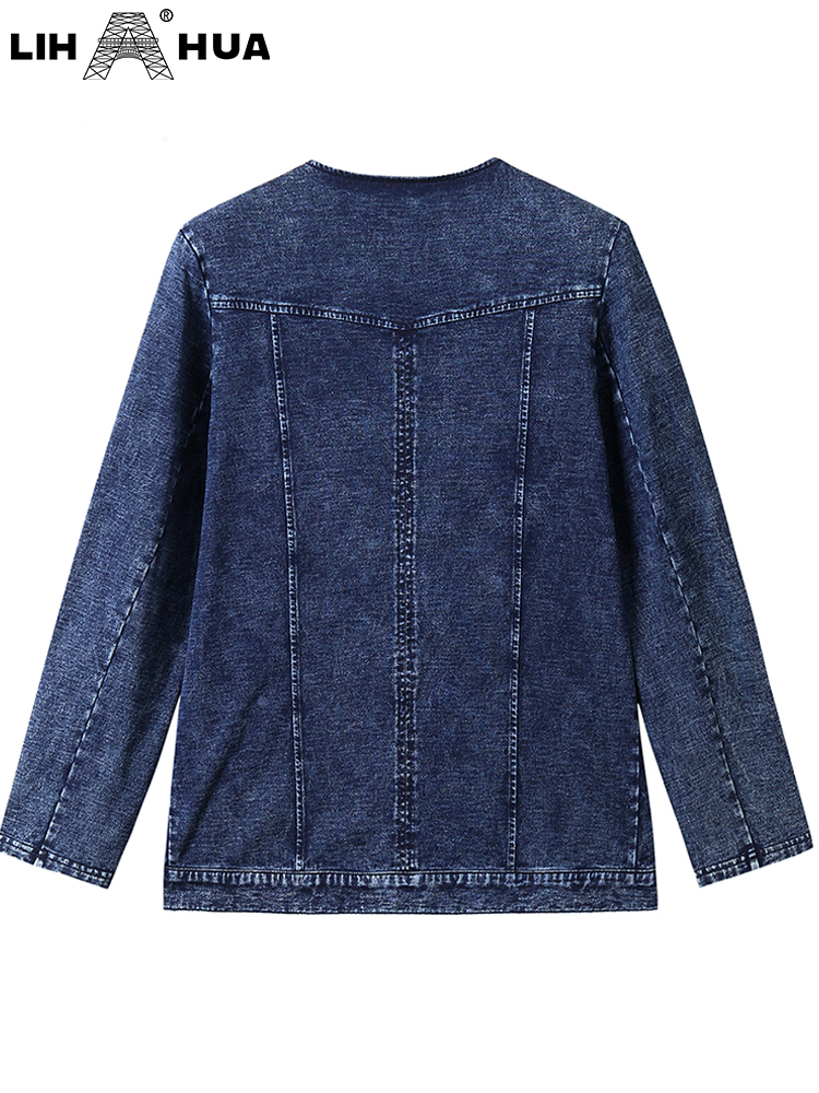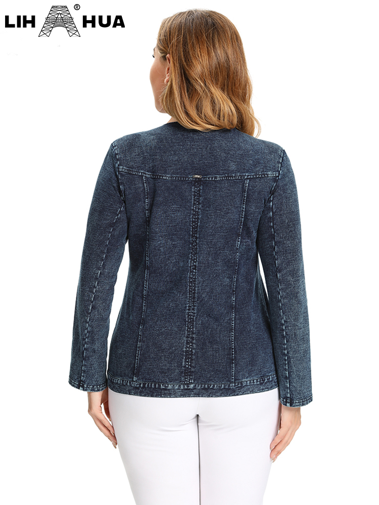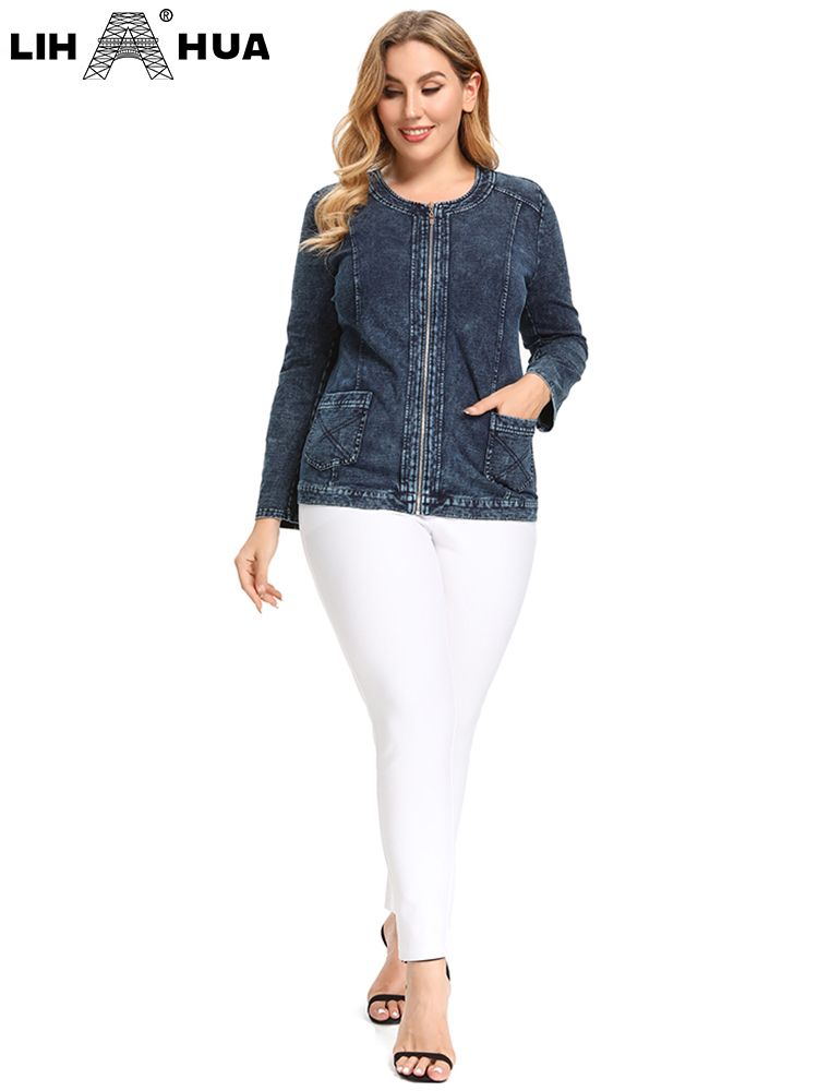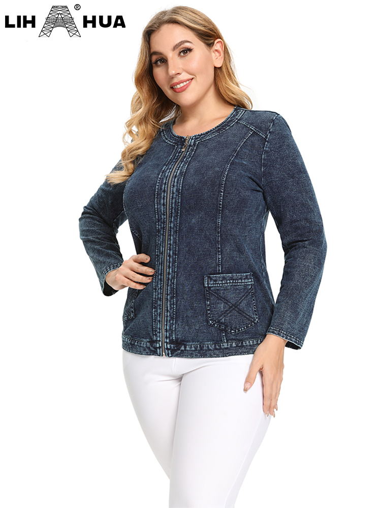 LIH HUA Women's Plus Size Denim Jacket Fall Casual Zipper Jacket High Stretch Cotton Knitted Denim
