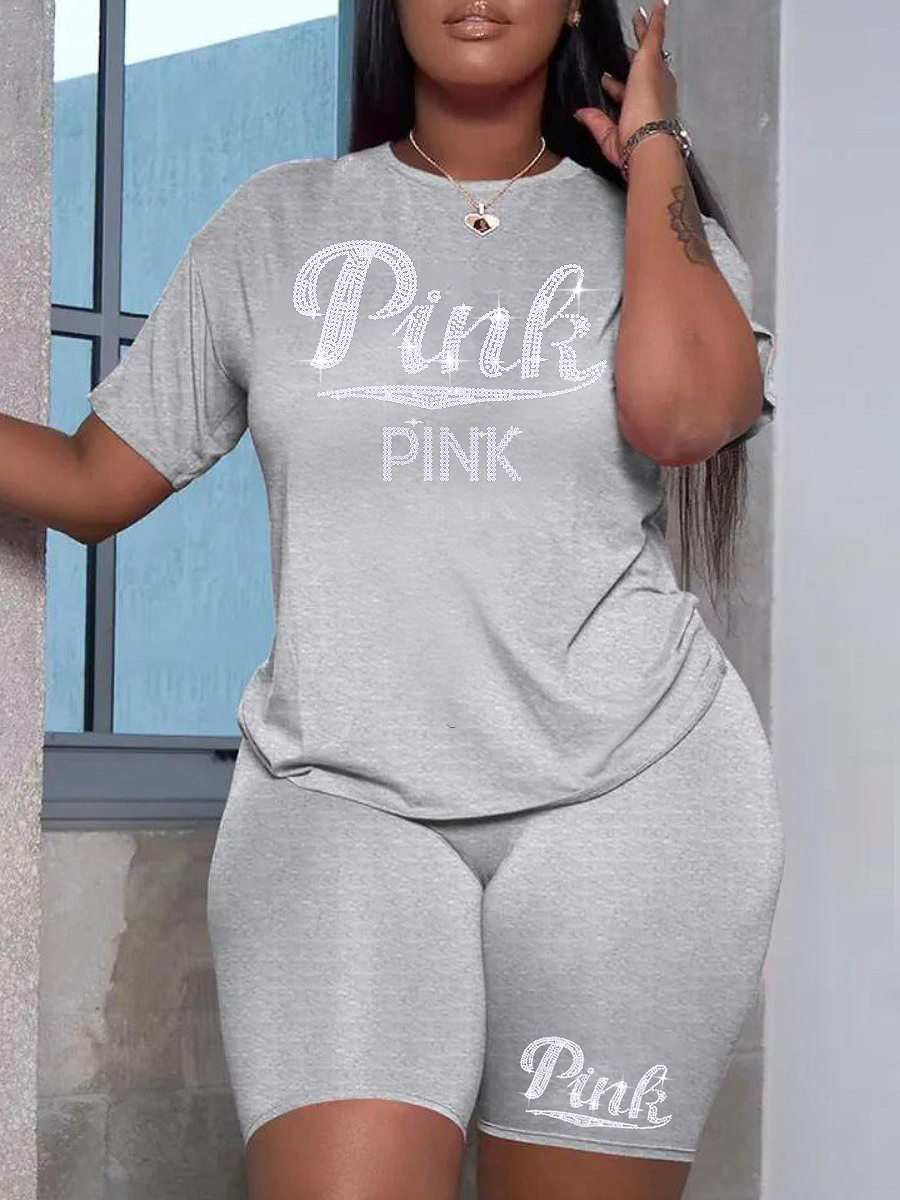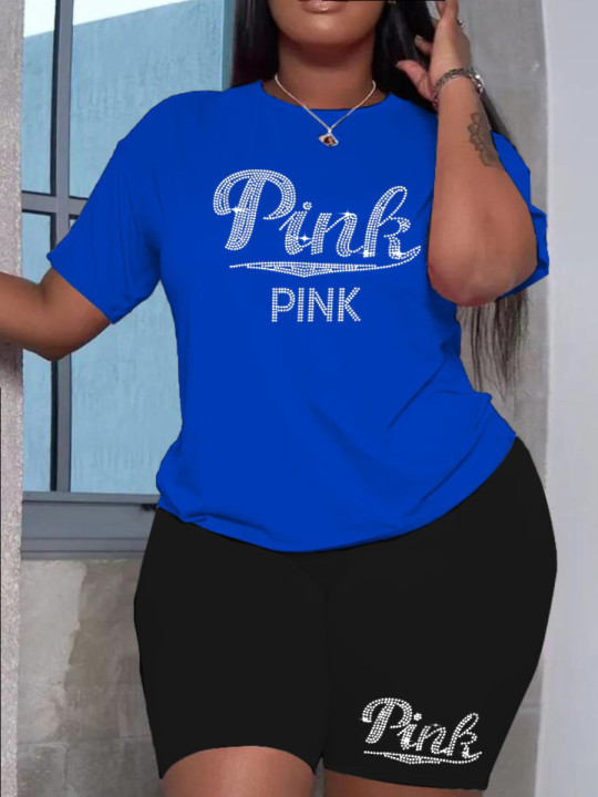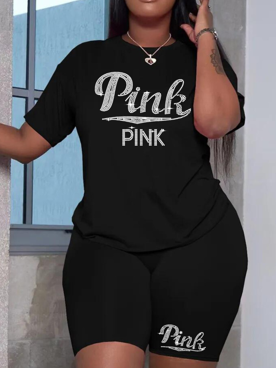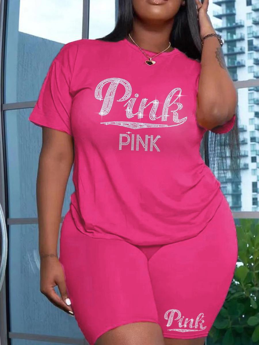 LW Plus Size Shorts Set F Rhinestone Letter Female Polyester Casual Regular Sleeve O Neck Matching Outfits Pink Summer Clothings
