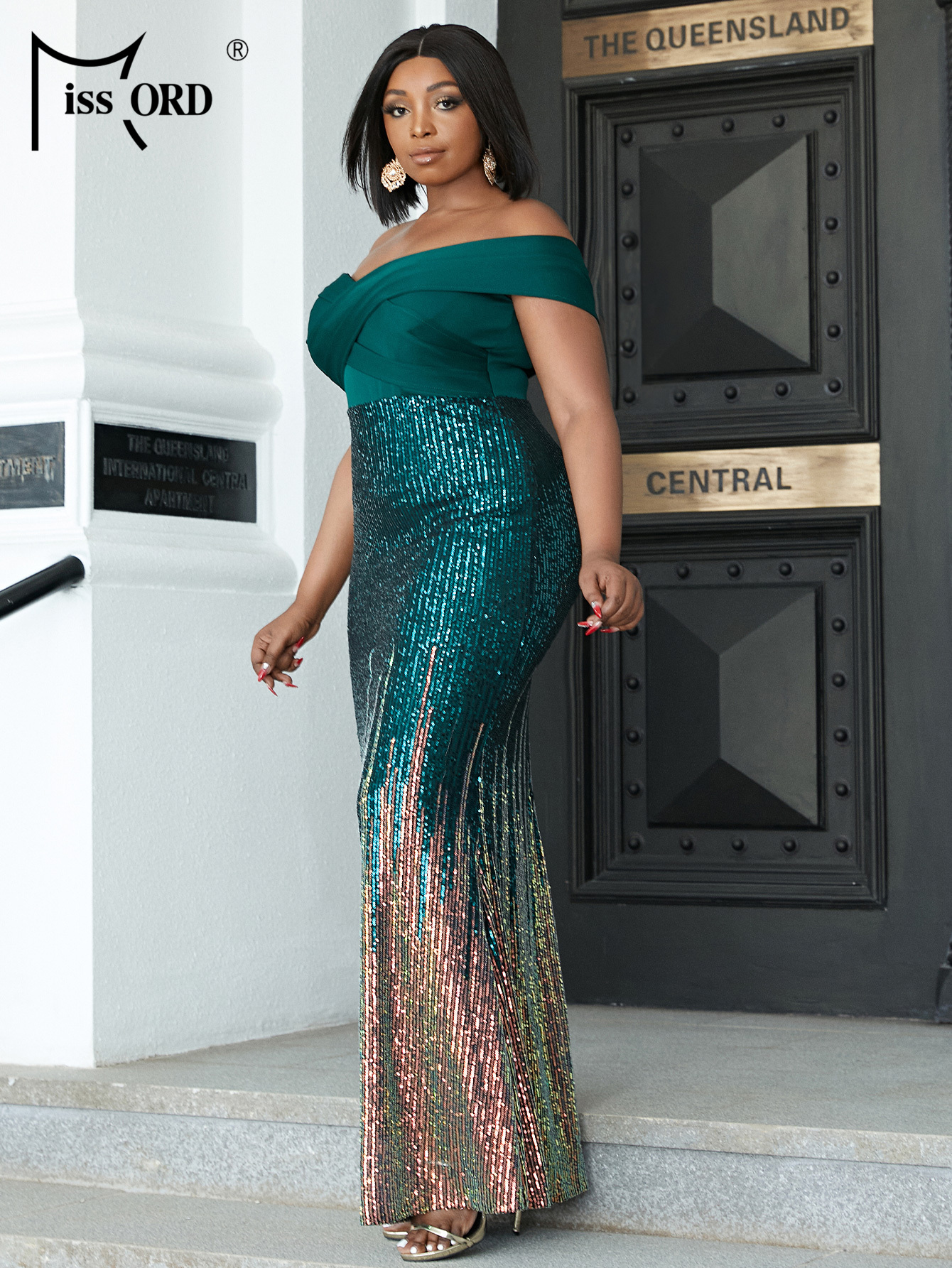 Missord Off Shoulder Sequin PlLUS SIZE Women Formal Dress Short Sleeve Large Maxi Evening Party Green Dresses Sexy Vestdios