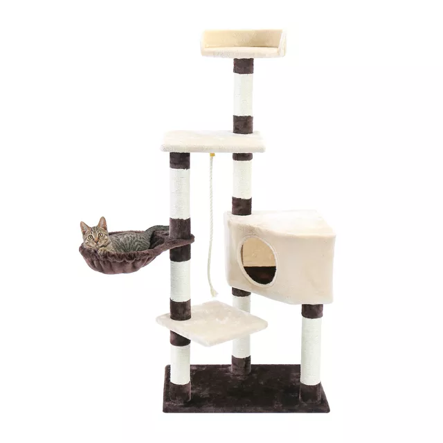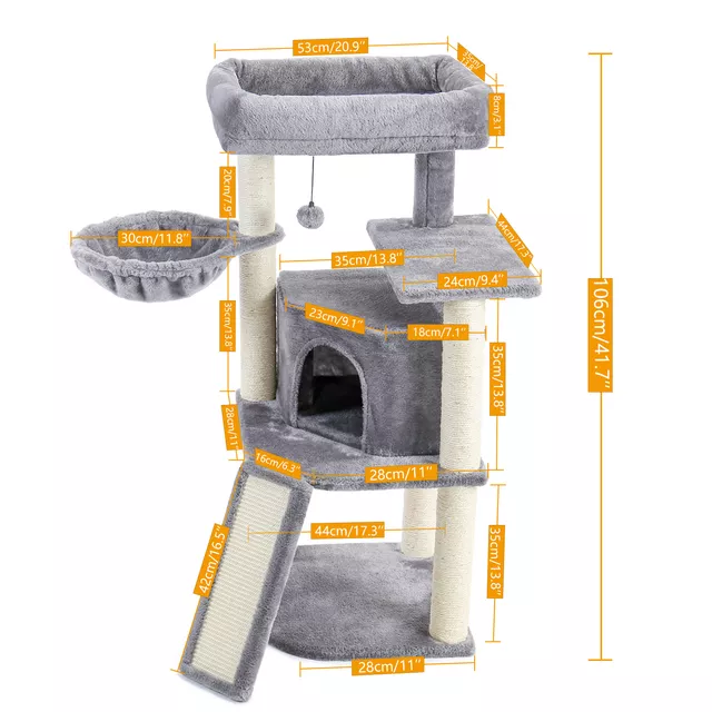 MULTILEVEL FUN: The 5 level platforms design provide different jumping heights for your cats to satisfy their daily exercise. Two roomy condos are super comfortable for your pet to roll, with lateral door and round holes are designed for cats to observe outdoor as well as allowing them to get in and out or jump to the top hammock. A cozy perch on the top not only allow your cat to have a nice rest, but also offer a best spot to enjoy sunshine and outside scenery.