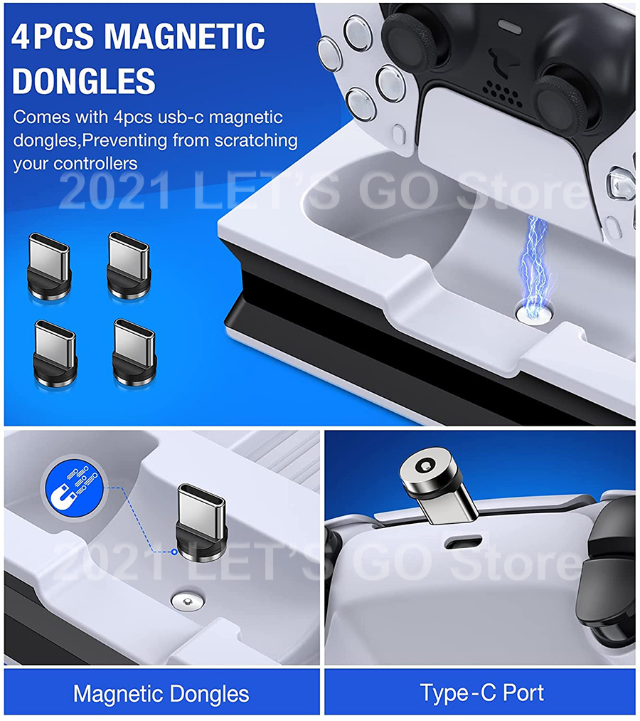 【CLEAR LED INDICATORS & EASY TO USE】 The battery status for PS5 docking station stand is clearly shown at a glance:Red LED means it is being charged, Geen LED indicates it is fully charged . Say goodbye to USB dongles and dock, Which can be a pain to get them into the dock . Come with 4 magnetic dongles , so Just put the PS5 charging station on the charging dock to charge .Free of worrying the PS5 controllers will be scratched and won't need to looking for the port or anything.