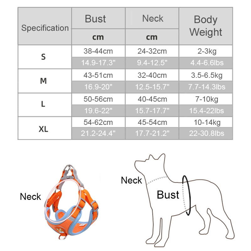 XL:  chest size 54-62cm, neck size 45-54cm, fit dog weight 10-14kg.