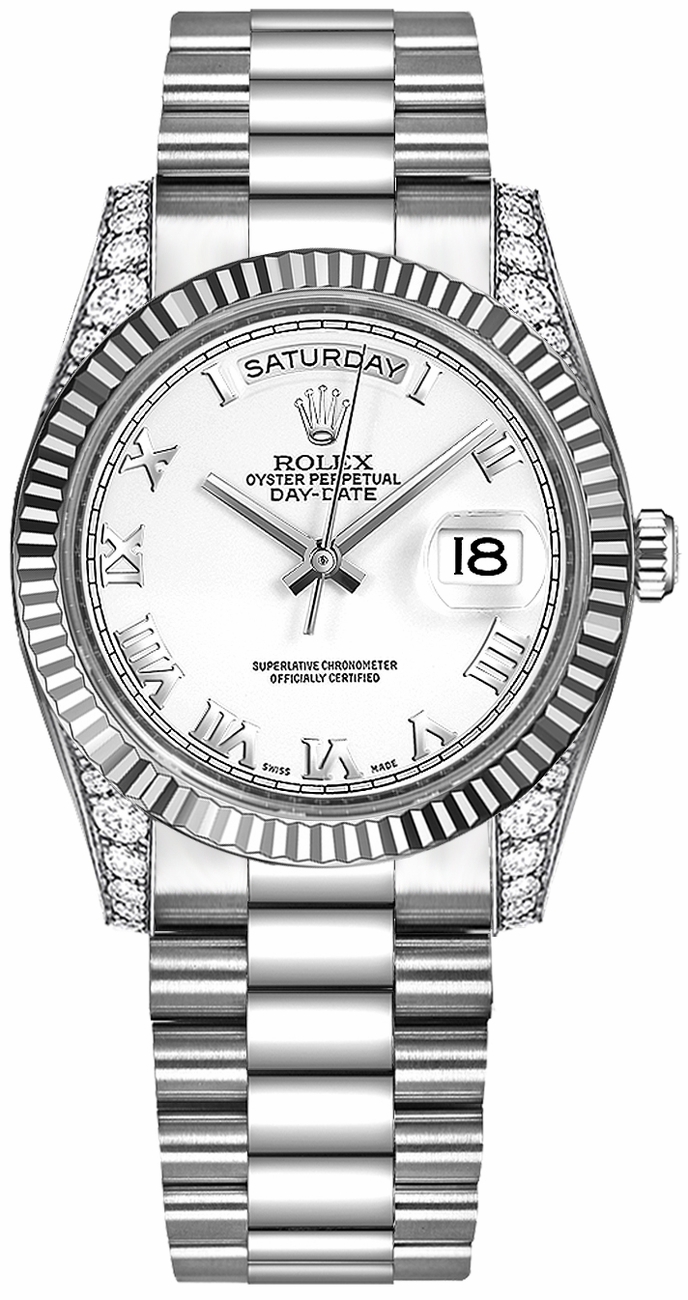 – White Dial with Roman Numerals – 32 Diamonds Set on Case – Solid 18k White Gold Fluted Bezel – Day and Date Features –