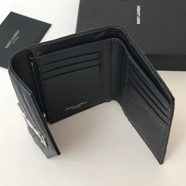 The Compact Tri Fold wallet looks chic in grain de poudre embossed leather, which is finished with interlaced YSL metal initials. Small enough to fit into even a tiny bag or clutch, yet with space for coins, notes and credit cards, this neat wallet is the ultimate mini companion.