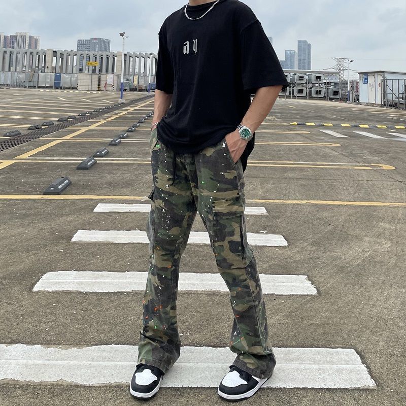 Streetwear Men Cargo Pants Hip-hop Distressed Camouflage Splash Flared Pants Men Women Pockets Drawstring Baggy Trousers