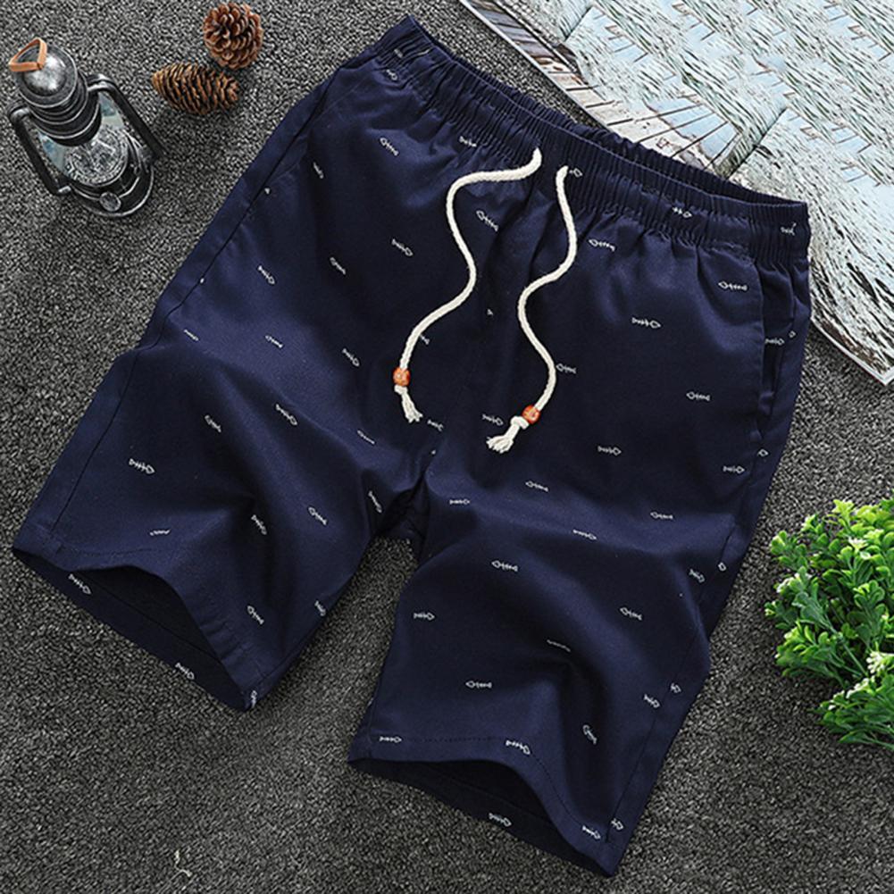 Mid Rise Fish Bone Print Men Shorts Loose Drawstring Pockets Short Pants Bottoms