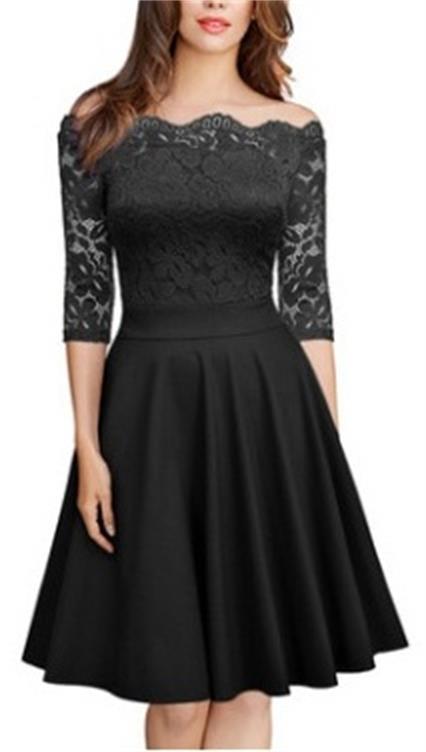 Summer Solid Color One Word Collar Dress Women Clothing Elegant Strapless Pleated Mid Calf Lace Dress Daily Evening Dresses