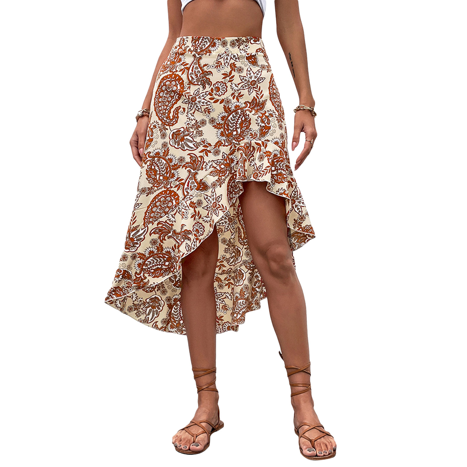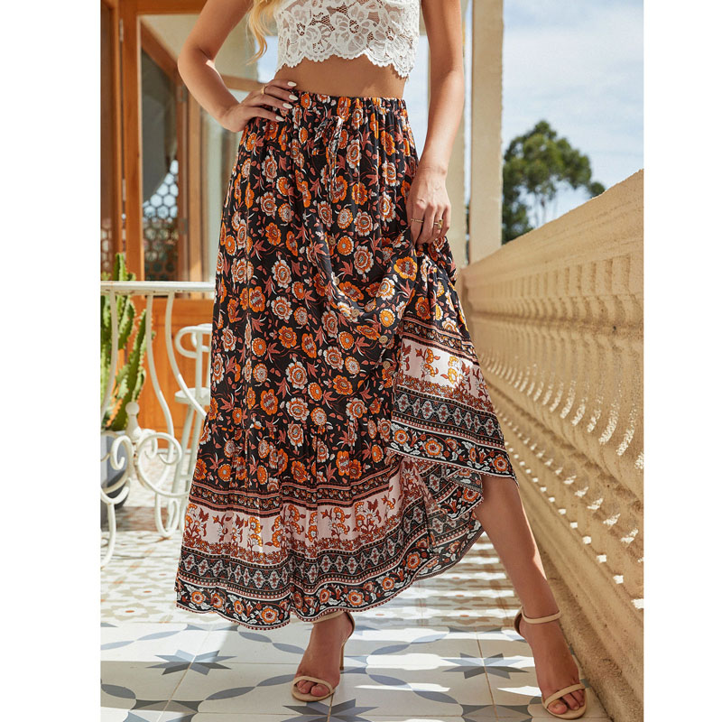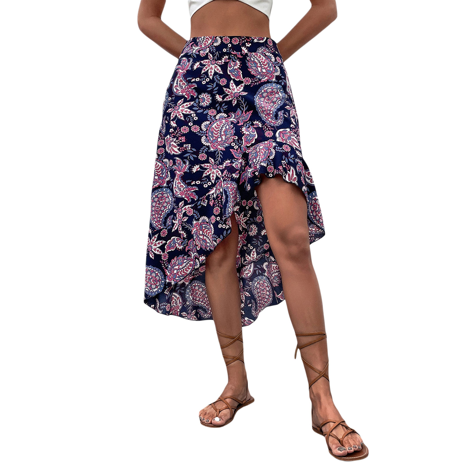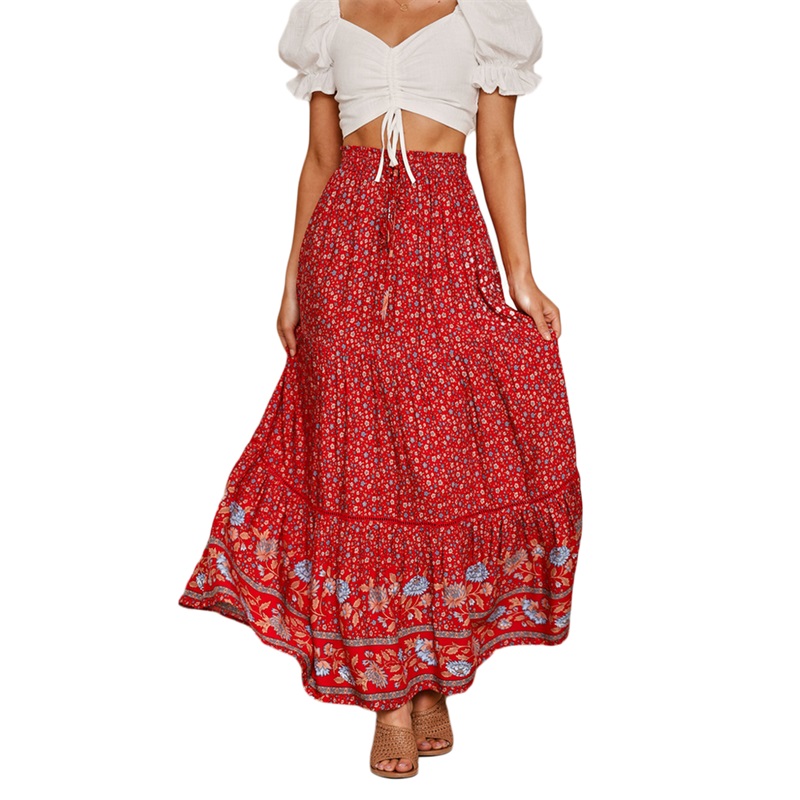 Summer Women Boho Floral Long Maxi Skirts Empire Beach Holiday Ruffles Skirt S-XL