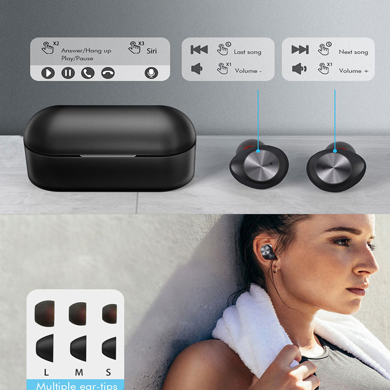 A complete set of standard equipment: host x1 pair, charging compartment 1, USB cable x1, manual x1, ear caps 5 pairs, packaging x1