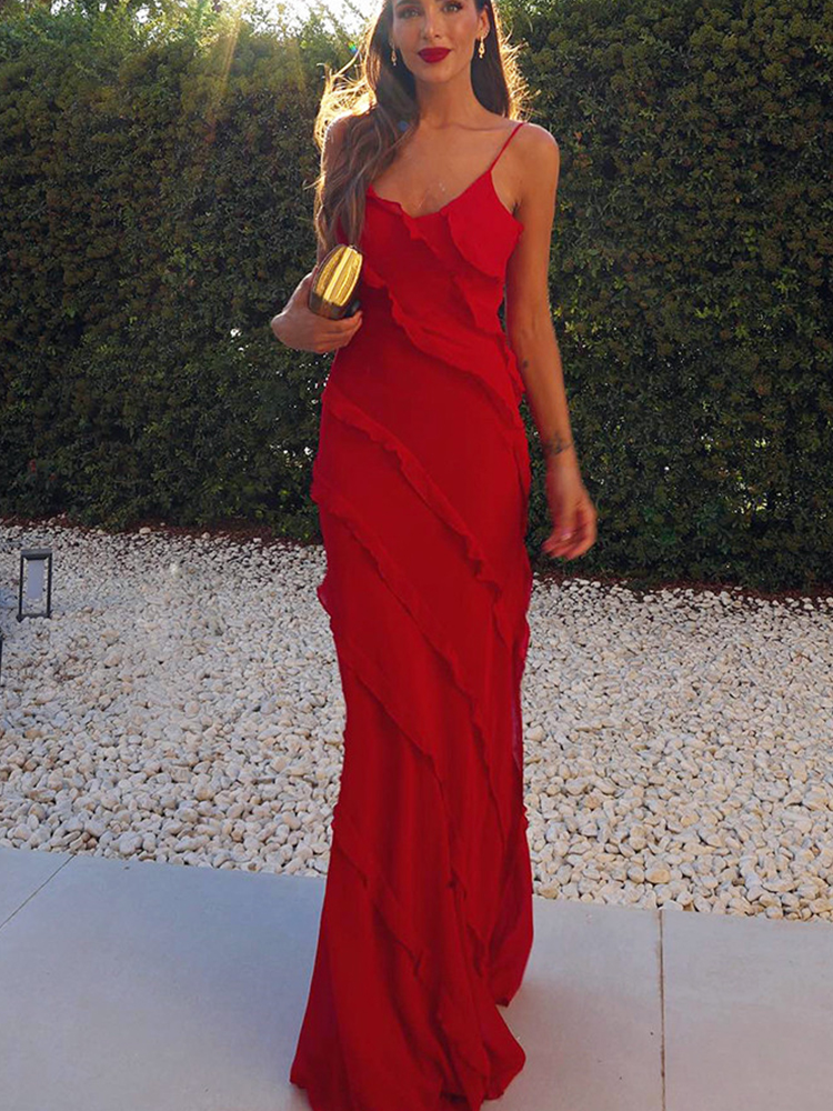 Tawnie Spaghetti Strap V Neck Maxi Dress Women Summer Elegant Ruffles Backless Sleeveless Bodycon Dresses Party Club Beach