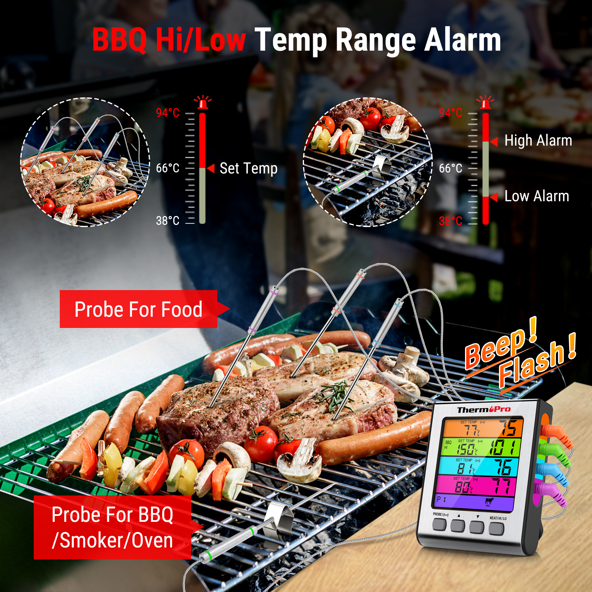 In BBQ mode, setting the highest and lowest temperature range, it will alarm when the temperature is out of that range.