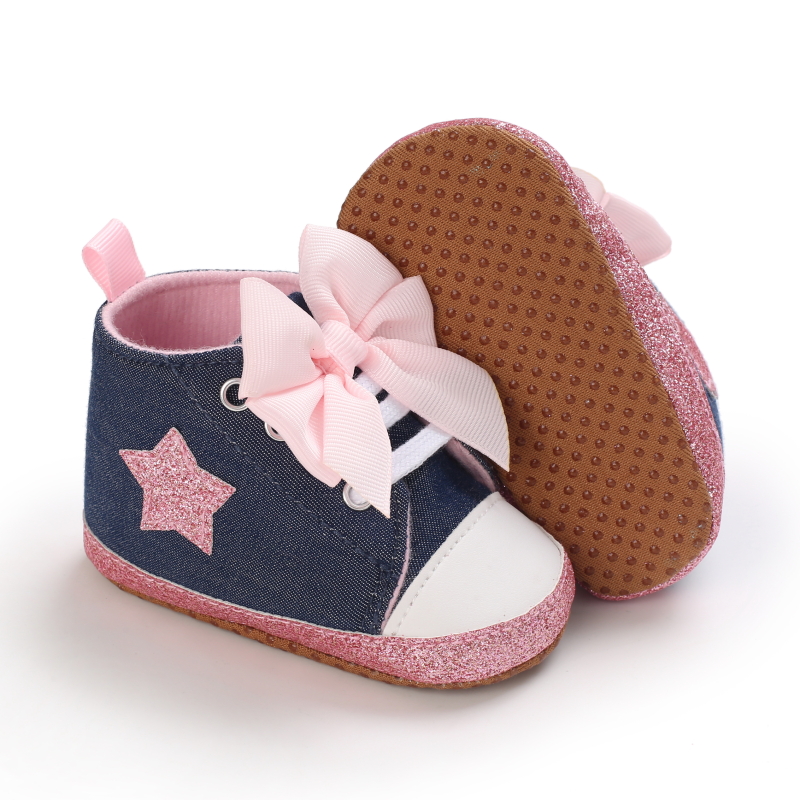 · FASHION : Classic star high top ankle style,Fashion and Casual Lace up sneakers,it's popular with your child.Cute style suit for indoor walking,crawling,playing ect.Best shower birthday gift for newborn.