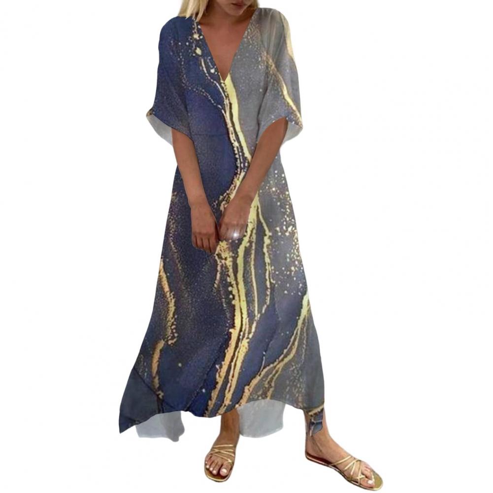 V-Neck Half Sleeve Large Hem Elegant Dress Vivid Flower Printing Ladies Loose Maxi Dress Female Clothing
