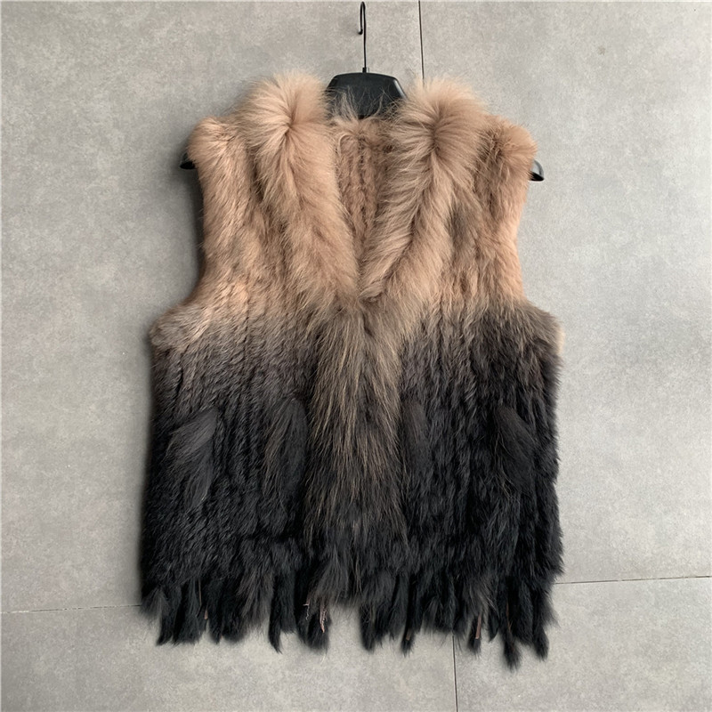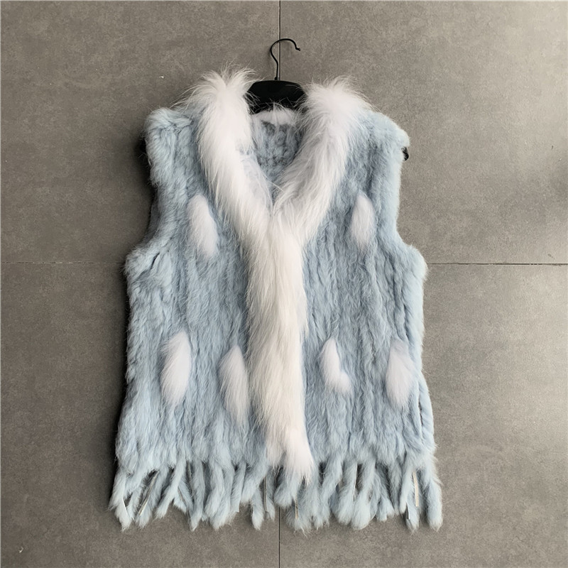 VR001 Free Shipping Womens Natural Real Rabbit Fur Vest With Raccoon Fur Collar Waistcoat/jackets Rex Rabbit Knitted Winter