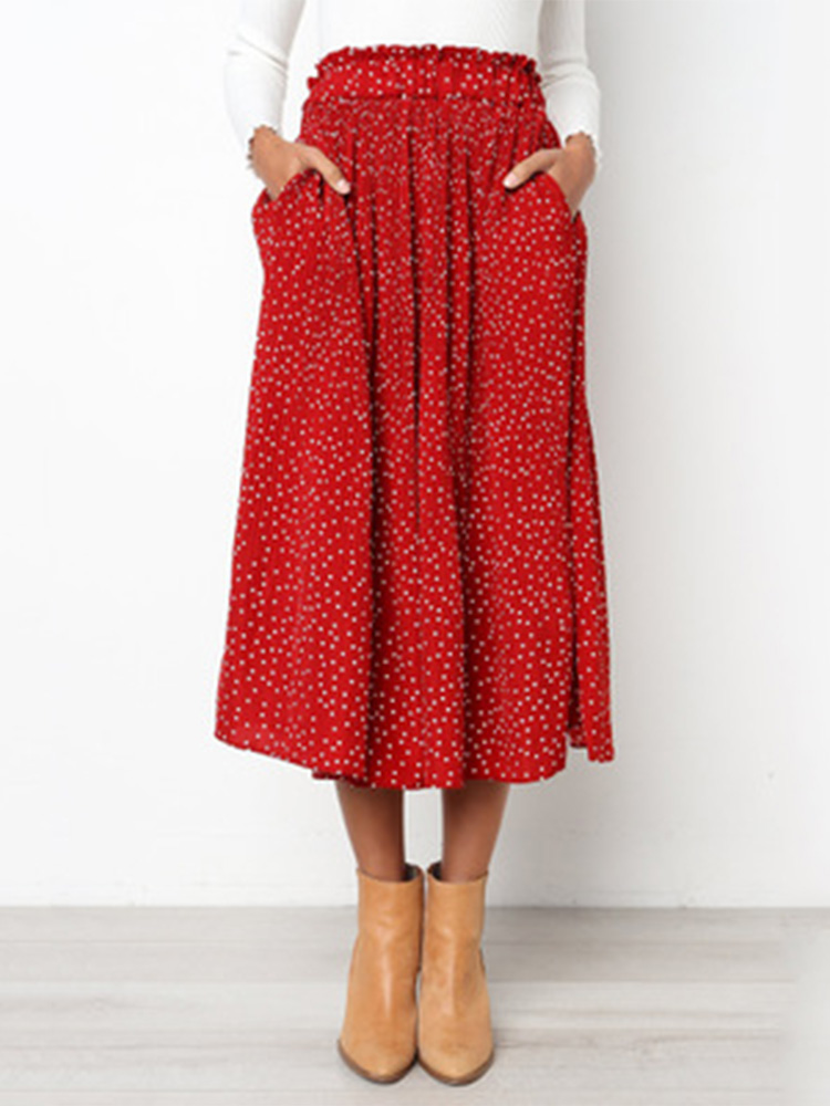 White Dots Floral Print Pleated Midi Skirt Women Elastic High Waist Side Pockets Skirts Summer Elegant Female Bottom