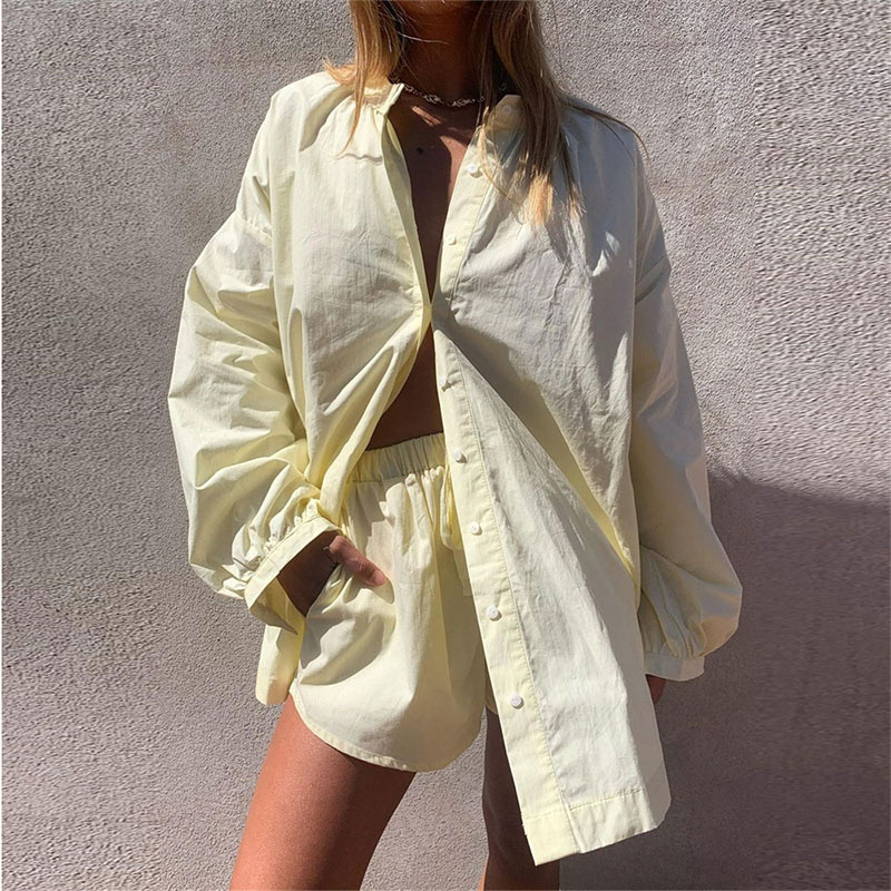 Women Casual Tracksuit Shorts Set Summer Long Sleeve Shirt Tops And Mini Drawstring Shorts Suit Lounge Wear Two Piece Set