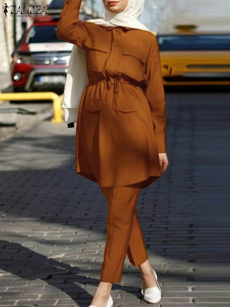 ZANZEA Casual Party Sets Abaya Kaftan Women Islamic Clothing Muslim Suit Solid Color Lapel Tunic Tops Drawstring Pant