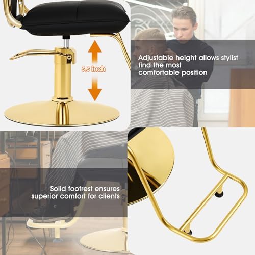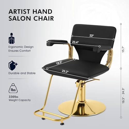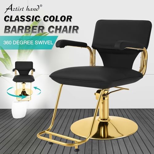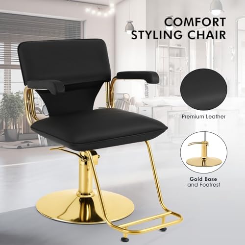 Very nice up to date salon chair I love the way its made, it has a step that touches the floor like others makes it easier for client to get into the chair, the chair is very comfortable and was on my back and behind the cushion is good quality the leather is very nice in appearance and quality does not look cheap and it swivels to make styling more easing and I can turn while client is sitting in the chair, this helps me out so much and its all black I love it blends in with my theme so well and looks better than the other chair I had in the past and it was easier to install assemble I really am considering order another.