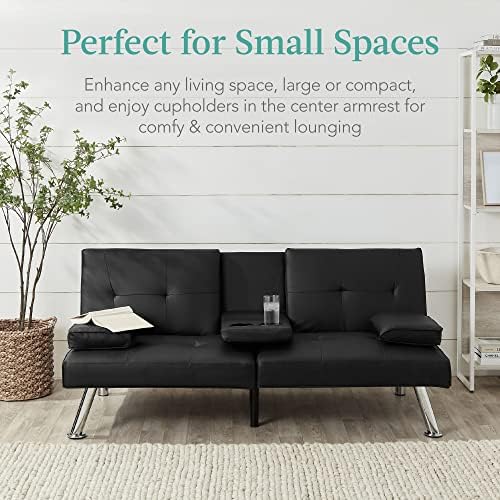 I recently purchased the Modern Convertible Folding Futon Sofa Bed in black, and I couldn't be happier with my choice! This versatile piece of furniture has quickly become the focal point of my living room, and for all the right reasons.First and foremost, the design of this futon sofa bed is sleek and modern, blending seamlessly with any decor style. The black color gives it a contemporary look that complements both bold and neutral color schemes. The clean lines and minimalist aesthetic truly make it an eye-catching addition to my space.One of the standout features of this futon is its convertible nature. It effortlessly transforms from a comfortable sofa to a cozy bed in just a few simple steps. The folding mechanism is smooth and hassle-free, allowing for quick adjustments based on my needs. The removable armrests add an extra level of convenience, enabling me to customize the setup according to my preferences.Comfort is definitely not compromised with this futon sofa bed. The seating and sleeping surfaces are plush and supportive, providing a cozy experience whether I'm sitting or lounging. The metal legs are sturdy and durable, ensuring stability and longevity. Additionally, the inclusion of two cupholders is a fantastic touch, allowing me to keep my beverages within reach while relaxing or entertaining guests.The quality of the materials used in this futon sofa bed is evident. The upholstery is soft and of high quality, making it not only comfortable but also easy to clean and maintain. I appreciate the attention to detail in its construction, as it feels well-crafted and built to last.Assembly was a breeze, thanks to the clear instructions and included hardware. I was able to set it up by myself in no time. The compact size of the futon makes it ideal for smaller spaces, making it a practical choice for apartments, guest rooms, or even home offices.Overall, I highly recommend the Modern Convertible Folding Futon Sofa Bed to anyone in need of a stylish and versatile furniture piece. Its modern design, comfort, and functionality are truly impressive. This futon has exceeded my expectations, and I'm confident it will do the same for you. Don't hesitate to make it a part of your home; you won't be disappointed!