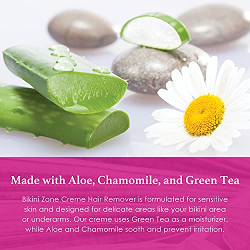 Bikini Zone Crème Hair Remover uses a special ultra-gentle formula that is fortified with green tea, aloe, and chamomile. Our solution not only removes unwanted hair quickly but it also smooths and soothe skin.
