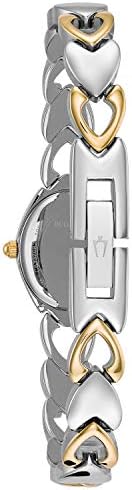 Show the world your shining love of life with this brilliantly polished, two-tone Bulova stainless steel women's dress watch. It's highlighted by the distinctive stainless steel bracelet, which mixes silver and hollow gold-tone heart shapes. It features a thin-profile, elongated oval silver watch case that measures 16mm wide (0.63 inches), and it frames the white dial face with a thin gold outline. The dial has a full Arabic numeral display in gold-tone, as well as tiny gold hands with seconds hand. This precise quartz timepiece also features a scratch-resistant mineral crystal, gold crown, and water resistance to 30 meters (99 feet).