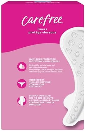 Introducing a whole new look for the Carefree brand you know and love. Carefree panty liners are designed to deliver comfort and multi-fluid protection against leaks, periods, odors, and everything in between. Carefree thong liners are discreet and made to fit thong underwear, to provide you confidence no matter what you wear. Stay-put wings keep your liner in place for a secure, no-shift fit, and end-to-end adhesive eliminates bunching. These liners for women can be used for every day freshness, odor control, sweat, unexpected periods, light days, tampon backup, leaks, and discharge.