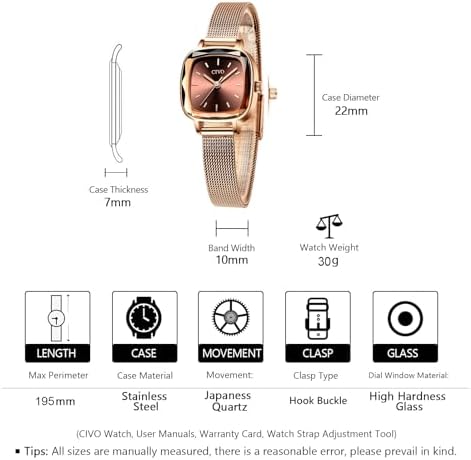 Attractive watch that so far (2 months) has kept time perfectly.I found the instructions for adjusting the band unclear but was able to figure it out by examining the latch. There are no links to remove. Instead, one half of the latch can be pried open to slide along the band, which has small grooves to help keep it from slipping once its pressed closed. However, I found it difficult to align these grooves. The band hasn't slipped, but the excess band is still there. It's not exactly in the way but in my case (I have very small wrists), moving the latch left a long tail that's a little awkward and has to be tucked under the strap when closed. It's also still a little too big but the difficulty of trying to align the grooves has so far deterred me from trying to get a better fit. Since the band is not elastic, it probably needs to be a little loose anyhow which allows the watch to rotateFor the price though, it looks great and I love that I don't need to remove it to wash dishes