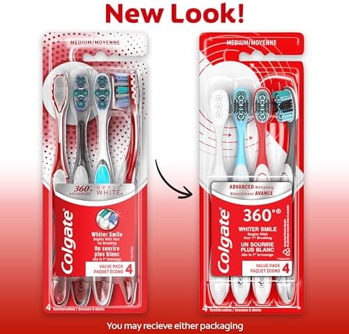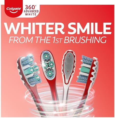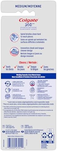 The Colgate 360⁰ Optic White Advanced medium whitening manual toothbrush features an advanced multi-action bristle design (vs. an ordinary flat trim toothbrush) and an innovative cheek & tongue cleaner design to remove bacteria from teeth, tongue, cheeks, and gums. The toothbrush also features spiral polishing bristles that help to remove surface stains from teeth, for a naturally whiter smile. It also features an ergonomic handle so that it fits comfortably in your hand. Flexible finger grips help the toothbrush to stay in place; reducing slippage and allowing for more precise maneuvering as you brush your teeth. Available in both soft and medium bristles.
