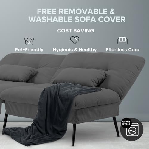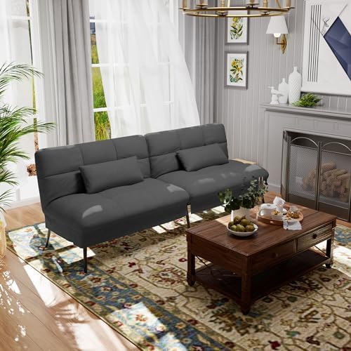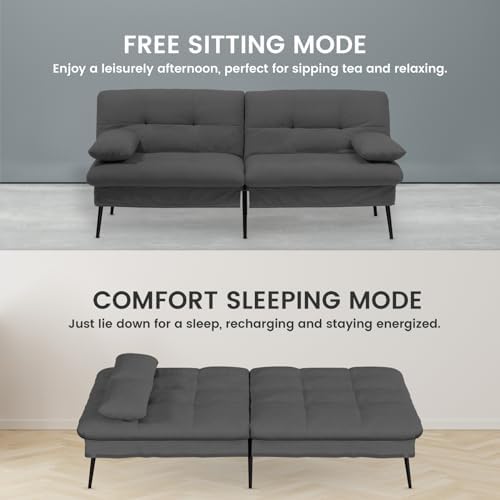 I was skeptical ! Price was great but I was so worried about the quality… and this little futon did not disappoint! It’s compact,it’s small but that’s what we wanted .Took a bit to figure out how to put it together ( instructions were mediocre) but once I did one side the other was easy. It’s super cute in my daughter’s dorm under her lofted bed and left just enough room for a side table. It easily converts to a bed. ( ideally Sleeping 1 person) She also loved that you can adjust the backs of the futon to lean so you can have a cozy movie night .The little arm pillows are not really necessary and they were pretty thin . Great for small spaces , and people not over 6’ tall .