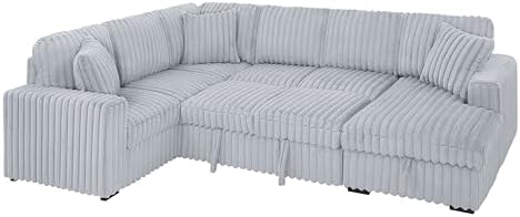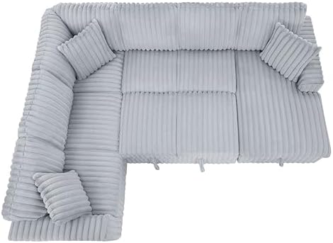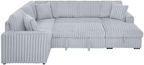 DEINPPA 122 Inch Sleeper Sofa Couch with Pullout Bed, Chunky Furry Corduroy Sectional Sofa with Storage Chaise and Charging Ports, Large Sectional Couches for Living Room-Grey